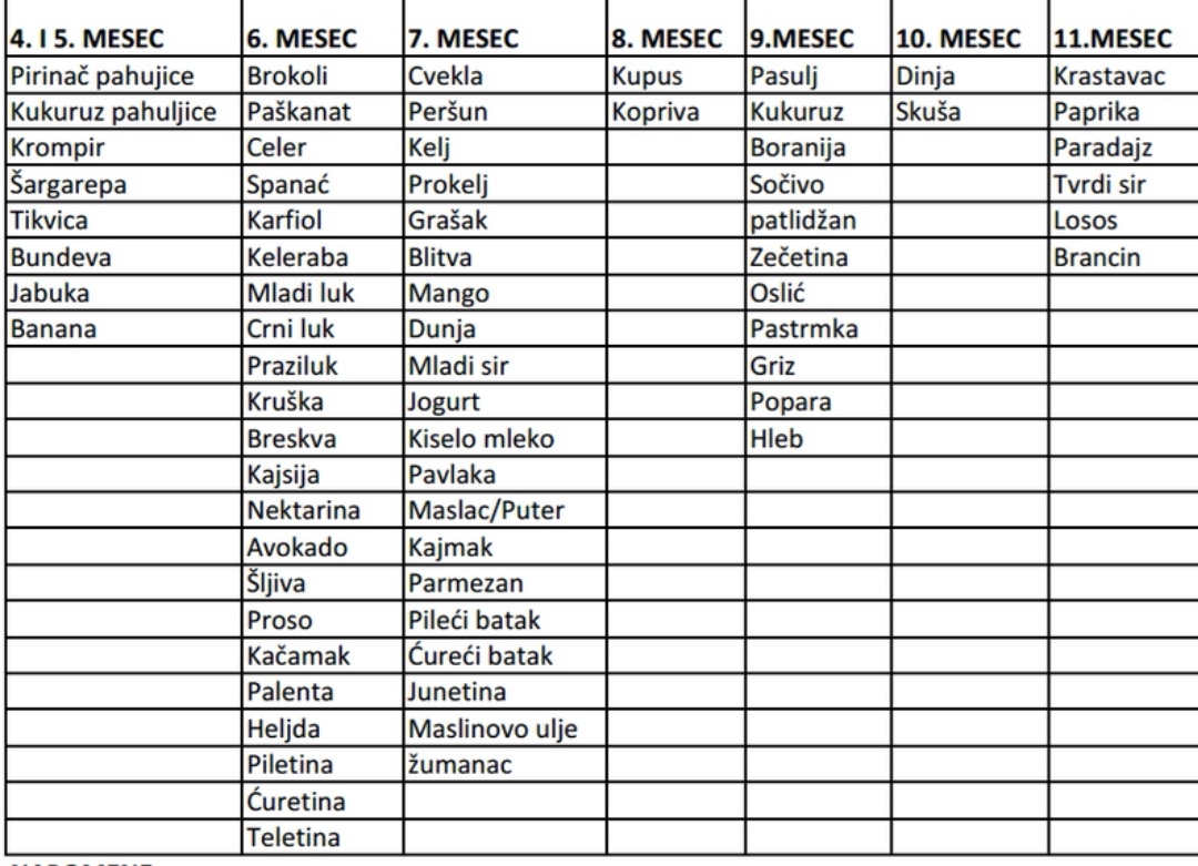 Zvuči zabrinjavajuće, ali ipak nije, bar ne iz mog iskustva, budući da moja deca sada jedu sve. S toga ću isto podeliti sa vama, pa možda nekom i pomogne. E, ovako sa uvođenjem čvrste hrane počeli smo sa četiri meseca i 20-ak dana. Najpre smo probali povrće, zatim žitarice i najslađe za kraj voće, budući da je voće slatko i deca ga lako i brzo prihvataju. Imajući to u vidu sa devojčicom prvi na repertoaru bio nam je krompir, koji joj se baš i nije nešto svideo i posle ga nije jela dugooo, sve do 15-og meseca. Čak i kada bih joj pomešala sa drugim povrćem, jok, slabije bi pojela obrok. Međutim, to se može desiti sa bilo kojom namirnicom, čak i sa onom koju je dete prvobitno prihvatilo, zato ne očajavajte! Danas ima tri godine i obožava krompir na sve načine. Sa sinčićem smo prvo probali šargarepicu, dečko je pa malo reći bio oduševljen. Svaku novu namirnicu koju uvodite tri dana dajete jednu istu zbog moguće alergije i to po 1-2 kašičice, s tim što količinu postepeno povećavate. Dalji redosled je bio isti tikvica, bundeva, šargarepa/krompir. Zatim smo krenuli sa žitaricama, pirinčane i kukuruzne pahuljice, pirinčane su oboje prihvatili bez problema, dok kukuruzne i ne bas na početku, međutim, već nakon nekoliko pokušaja jeli su ih ne praveći problem. Bitno je da oni nauče ukuse, posle sve ide lagano, tako da moj vam je savet da sve što je predviđeno za njihov uzrast date svom mališanu. Šta reći, morate imati razumevanje za male anđelčiće koji nemaju pojma šta im se dešava, ipak su oni do tada bili samo na siki odnosno flašici. A ovo je ipak nešto novo i za njih, gidni još uvek ne umeju ni da pokupe hranu sa kašičice, a i ukoliko bi je pokupili slučajno, ne znaju šta sa njom, ali polako, naučiće i to brže nego što očekujete, verujte mi. Stoga naoružajte se strpljenjem iiii započnite "igru"!!! Pre nego počnete, očekujte da će hrane biti na sve strane, a najviše po vama i vašem mališanu. Ali nije to tako strašno, sve se da oprati xexe... najbitniji je učinak, kada vidite sito i nasmejano dete, nakon svih tih slatkih muka osećaj će biti božanstven. Baš kao što vi volite da jedete u prijatnoj atmosferi, isto obezbedite i vasem mališanu i uspeh će biti zagarantovan!!! Moja preporuka da dete udobno smestite u hranilicu, dubak, ljulju... Tačnije gde mislite da se ono oseća najprijatnije, uklonite sve igračke iz njegovog hvatoruka, jer bi to dodatno otežalo hranjenje(a pritom bi nakon hranjenja iste morali i da perete, mučno, zar ne?! ), u pozadini pustite dečije pesmice i otpočnete sa animiranjem i hranjenjem deteta. Ono što je možda najvažnije i najteže jeste da olako ne odustajete, u startu izdvojite i do 2-3 sata po obroku i potrudite se da dete pojede što veći deo obroka. S tim da imate u vidu da dete neće baš uvek pojesti istu meru, već nekada može više, nekada manje u zavisnosti od gladi i od onoga što jede. Evo, sada se baš sećam kada smo jednom bili u poseti kod mojih roditelja i sada ja hranim svoju princezu, koja naravno zeka, pljuje, izbacuje, razmazuje kašicu po sebi, stolu, podu... ali ja ne odustajem i kaže meni ćale "ti dok joj daš jedan obrok, dođe vreme za drugi, ne muči dete", eh to vam je ono što kažu kada vam sipaju so na ranu...Ali nastavila sam, ne osvrćući se na njegov komentar i nakon 2h i 15min moja devojčica je pojela celu kašicu, mojoj sreći nije bilo kraja, juuuupiiiii ipak sam uspela!!! Stoga i slušajući mnoge druge slične priče, ne brinite i ne dozvolite im da vas obeshrabre, jer taj period traje najviše 2 meseca, i kada to izgurate više nećete imati problema oko hrane. To vam je čitava filozofija. Evo i tabele kojom sam se ja rukovodila i sa prvim i sa drugim detetom i oba puta mi je i te kako pomogla. Ko krene mojim stopama puno srećeee!!!